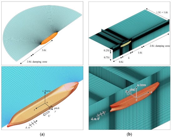 where N indicates the number of elements in the index set Ic. (i, j, k) is the index pair of the i-th, j-th, and k-th grid point in the x-, y-, and z-direction, respectively. L is the ship length, B is the ship beam, T is the ship draught, A is the amplitude of incident wave, xci, ycj, and zck are the center positions, and ∆xi, ∆yj, and ∆zk are the size of the i-th, j-th, and k-th cell, respectively. The grid spacing outside of the range in Equation (13) remains the same to generate the incident wave with the same grid resolution, while the inside grid is systematically refined, which has the ratio of the average grid spacing larger than the square root of two. The total number of grids varied from about two million to five million and the GCI can be obtained using the following procedure: