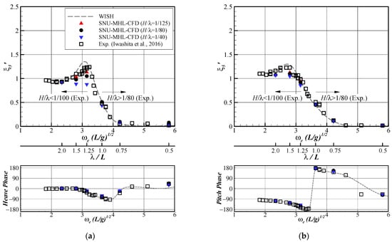 Here, k means the wave number of the incident wave and the horizontal axis in the figure represents the normalized encounter frequency ωe(L/g)1/2 as well as the normalized wavelength λ/L. The numerical computations using the Cartesian-grid method were conducted with H/λ = 1/80 and 1/40, where H and λ are the wave height and wavelength of the incident wave. In addition, the smaller wave steepness condition (H/λ = 1/125) was simulated for the cases where the wavelength is 1.25 times longer than the ship length. In References [13,14], the wave steepness was varied from H/λ = (1/200 to 1/56). It is difficult using the Cartesian-grid method to generate the incident wave accurately with small-wave steepness in short-wave cases for both experiment and numerical simulation, while in the Rankine panel method, the linearized free-surface and body boundary conditions were applied. The overall magnitude of heave and pitch motions are similar to each other, whereas for the Cartesian-grid method, smaller heave response can be found near the resonance region (λ/L = 1.25). However, if the amplitude of the incident wave decreases, the magnitude of heave motion becomes close to the others. This nonlinearity is known to be responsible for the cross-coupling damping of heave and pitch if the ship has a large flare angle.