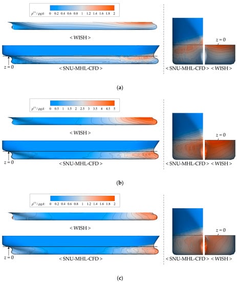 The first harmonic amplitudes of the wave-induced pressure distribution over the whole ship surface for three different wavelengths are compared in Figure 6. The first harmonic amplitude of unsteady pressure is normalized with the maximum value of linear dynamic pressure of the incident wave ρgA. In each figure set, the left column is the side view and the right column is the front view. The upper figure in the left column is the result of the Rankine panel method (WISH), while the lower figure is the result of the Cartesian-grid method (SNU-MHL-CFD). For the short-wave case (λ/L = 0.5), the ship motions can be ignored, and the incident wave is passing through the mid-ship section. Thus, the magnitude of first harmonic pressure is similar to that of the incident wave. On the other hand, the first harmonic amplitude of unsteady pressure is almost zero at the mid-ship for the long-wave condition (λ/L = 2.0) because the ship is surf-riding on the incident wave. The amplitude of the first harmonic from the Rankine panel method near the still-water-level is larger than that from the Cartesian-grid method, especially in the ship bow region, because of the linear assumption. Near the bulbous bow and the ship stern, a slight difference can be observed, whereas the overall patterns below the still-water-level are similar to each other. In the bulbous bow and the ship tern, the aspect ratio of the panel is higher than that in the other parts, and this gives an inaccurate solution.