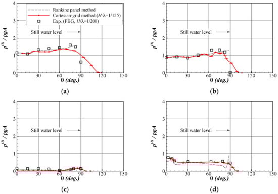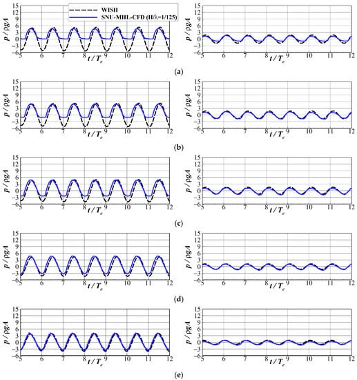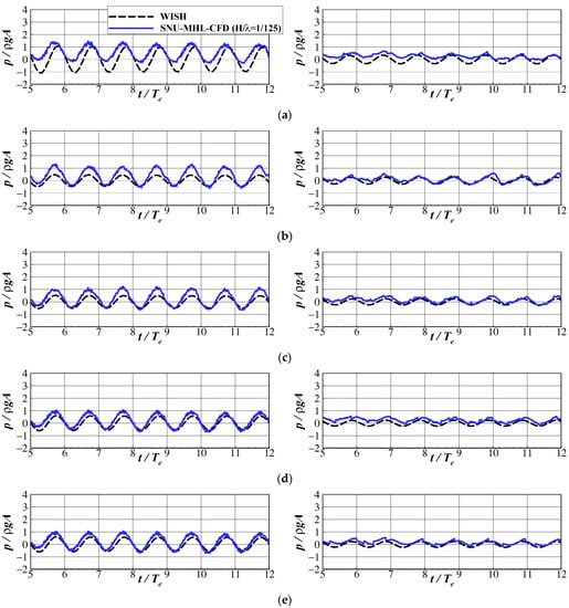 In the case of stern flow (Ord. = 0.5), the two numerical computations show different magnitudes of wave-induced pressure for the resonance case, even for deeply submerged positions, as shown in Figure 8. In particular, the pressure magnitudes around the crest are different, whereas those around the trough region show similar values to each other. This implies that there are higher harmonic components in the results of the Cartesian-grid method. The magnitude of the unsteady pressure is very small in the stern region for the short-wave condition because of shadowing effects. It should be noted that the time histories of pressure in the Cartesian-grid method show slightly oscillatory behavior. It is known that an immersed boundary method suffers spurious oscillation in pressure fields, especially when a solid body moves, and a grid point is abruptly changed from one phase to another [24].