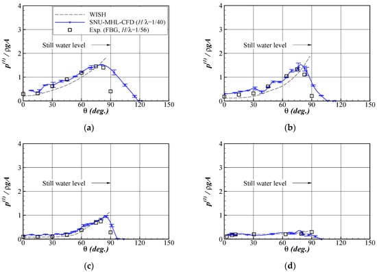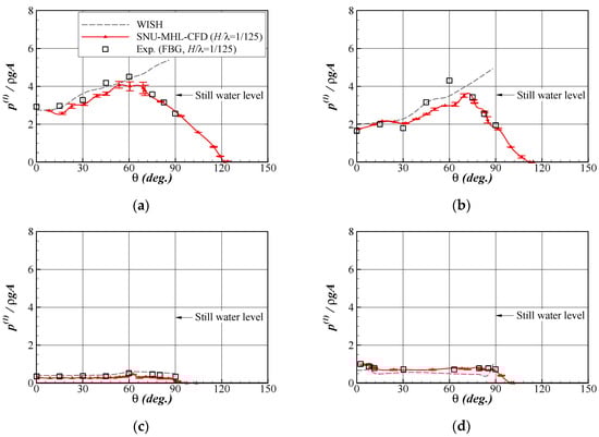 Magnitude of the first-harmonic pressure component for the RIOS bulk carrier in waves, λ/L = 2.0.: (a) Ord. = 9.5 (bow region), (b) Ord. = 9.0 (bow region), (c) Ord. = 5.0 (mid-ship), (d) Ord. = 0.5 (stern region).