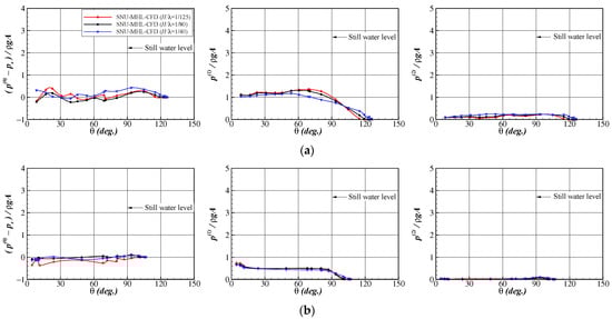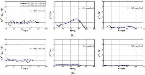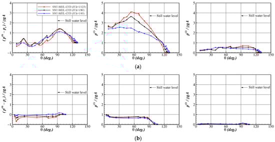 Figure 12, Figure 13 and Figure 14 compare the magnitude of the zeroth-, first-, and second-harmonic components of wave-induced pressure for λ/L = (0.5, 1.25, and 2.0), based on the results of the Cartesian-grid method. The steady pressure ps in calm water condition is subtracted from the zeroth-harmonic component. This quantity is closely related to the added resistance in waves and has been defined as the time-averaged added pressure. In the case of ship bow (Ord. = 9.5), it is a positive value near the still-water-level because of wave inertia and this effect is exponentially decaying in the vertical direction. There exists negative added pressure due to suction pressure, which is corresponding to the velocity square term in Bernoulli’s equation. However, if the relative ship motion becomes negligible (λ/L = 0.5 and 2.0), the difference of inertia and suction effects is small, which means the added resistance becomes small. In contrast, the added pressure shows relatively large magnitude in the resonance condition, as shown in Figure 13a, and this implies that the added resistance is larger than that in the short-wave or long-wave conditions. It is also clearly observed that the positive added pressure occurs near the still-water-level, while the negative value exists below the still-water-level. Moreover, the vertical distribution range of positive added pressure increases with increasing wave amplitude.
