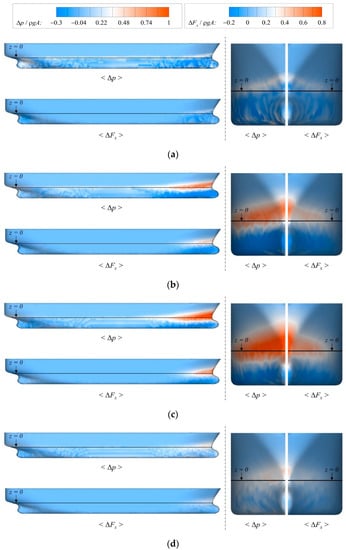 To investigate the characteristic of added resistance in head waves more clearly, Figure 15 plots the time-averaged added pressure and the added local force in the longitudinal direction obtained using the Cartesian-grid method. In the previous study [17], the added pressure Δpk was defined as follows: