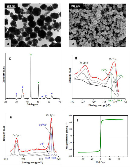 Figure 1a,b depicts TEM and SEM images, respectively, showing that CFNS is composed of nanospheric particles with a mean diameter of 150 nm, which was determined by an open-source image processing program ImageJ based on different TEM images and an SBET value of 47 m2/g. Figure 1c shows the XRD patterns of CFNS, which was composed of three phases: cubic CuFe2O4 (67.5%), Cu2O (17.1%), and Cu (15.4%), with average crystallite sizes of 7.7, 9.8, and 90.0 nm, respectively. The presence of metallic Cu and Cu+ ions was due to the reduction by ethylene glycol of some Cu2+ ions present in the solution [75,76,77,78,79,80].