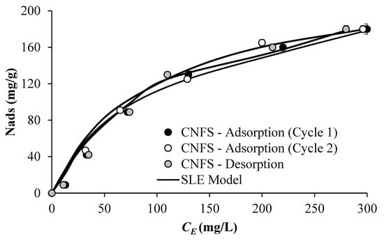 Asphaltene adsorption/desorption isotherm on CFNS, and SLE model correlation at 25 °C.
