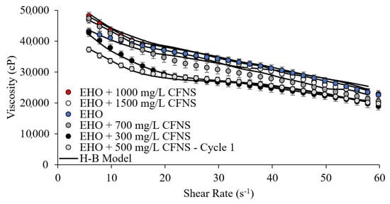 Figure 3 shows the rheological evaluation through the flow curve of the EHO and its mixtures with CFNS at different concentrations (300, 500, 700, 1000, and 1500 mg/L). The behavior described for the evaluated samples is typical of this class of fluids, showing a shear-thinning behavior, that is, oil viscosity decreases as the shear increases. Mortazavi-Manesh and Shaw [21,34], Bazyleva et al. [62], Mozaffari et al. [87], Tao and Xu [88], and Taborda et al. [44] found similar results. Clearly, viscosity reductions are detected when adding up to a concentration of 700 mg/L of the material, obtaining the largest viscosity change at 500 mg/L. However, a shear-thinning effect of EHO is visible (viscosity dependent on the shear rate), which is expected behavior in a non-Newtonian fluid. These phenomena (viscosity reduction) are due to the interaction between CFNS and aggregates of asphaltene in the EHO structure. The asphaltene adsorption over the CFNS promotes a breakdown of the viscoelastic network that favors the reduction of their viscosity. The explanation for this phenomenon is widely explained in previous works [38,43,44,45,46,89,90,91].