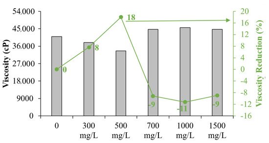 As can be seen in Figure 3, when the concentration exceeds 1000 mg/L, the effect on viscosity reduction is negligible, and a slight increase in viscosity may appear in the mixture of EHO and CFNS. This is due to an agglomeration effect of the nanoparticles themselves inside the highly viscous fluid. The agglomeration causes the particles to behave as larger solids, reducing the interaction with asphaltenes and promoting an increase in viscosity, according to Einstein’s theory of viscosity [92]. Figure 4 shows the degree of viscosity reduction for all CFNS dosages evaluated in EHO, which was performed at low shear rates (7.1 s−1) [93,94,95]. Notably, at 500 mg/L, a viscosity reduction of 18% was obtained, showing the best performance of CFNS over a wide range of concentrations evaluated. This is a promising result in the search for a nanofluid design capable of enhancing transport processes. Moreover, the process may eventually generate a reduction in the consumption of diluents with economic and energy savings.