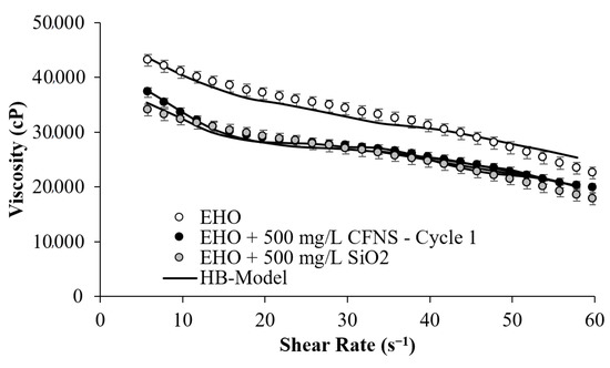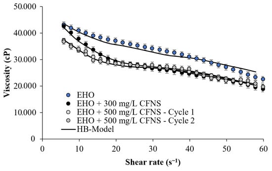 Evaluation of the second cycle of CFNS performance was performed by reusing the particles after the first cycle of viscosity reduction. For this process, it was decided to use the dosage that showed the best performance in the first cycle, that is, 500 mg/L. Figure 5 shows the performance of the CFNS in its second cycle of use. It can be seen how the reduction of viscosity is statistically equal to that obtained in the first cycle, which shows the reuse capacity of the particles for reducing EHO viscosity. Note that the performance of the CFNS for the two cycles evaluated showed a similar behavior over the shear rate evaluated. There is a slight deviation between the two measurements, mostly at a shear rate lower than 10 s−1.