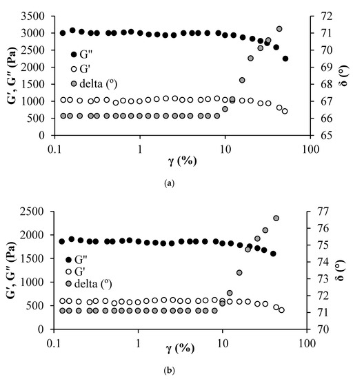 Figure 8 shows the obtained storage modulus (G′), loss modulus (G′′), and the phase angle (δ). For both EHO in the presence and absence of CFNS, it is observed that as the strain increases up to 2%, the moduli do not change. Hence, the LVR is given for strain values between 0.1 and 10%. G′′ is always higher than G′, indicating that the sample’s behavior is more viscous than elastic. The G′ decreases when 500 mg/L of CFNS are added to the EHO, suggesting lower internal resistance and lower viscosity. Meanwhile, δ is always higher than 45°, indicating a liquid-like behavior [96,97,98].