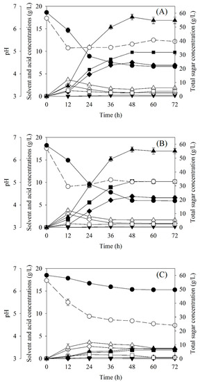 Batch ABE fermentation profiles on sweet sorghum juice (SSJ) supplemented with 1.27 g/L (NH4)2SO4 (A), P2 medium (B) and SSJ with no nutrient supplementation (C): acetone (♦), butanol (■), ethanol (▼), ABE (▲), acetic acid (◊), butyric acid (□), total acids (∆), pH (○) and total sugar (●).