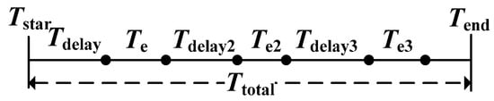 The total grid-connection time of the EV is set to Ttotal. To avoid the loss of battery owning to frequent charging and discharging, the maximum daily discharge frequency of EVs under the V2G mode was set to one. The discharge operation was not allowed until the initial charging of the EVs was complete, and the discharge was terminated before reaching the maximum allowable discharge level. Then, secondary charging was performed according to the scheduling instructions until charging was terminated. The charging and discharging time distributions of the EV are shown in Figure 2. Tdelay indicates the first delay in charging, Tdelay2 indicates the delay, Tdelay3 indicates the second delay, Te and Te2, respectively, indicate the charging and discharging times, Te3 indicates the second charging time, and Tend indicates the off-grid time of the EV.