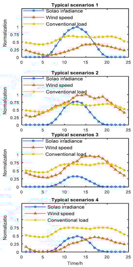 The four typical scenarios of wind speed, solar irradiance, and conventional demand for load, obtained based on the maximum principle of the pseudo F-statistic (PFS), are shown in Figure 6. Based on the uncertainty of wind power and light, four typical scenarios constructed in this paper represent the fluctuations of wind speed and light throughout the year.