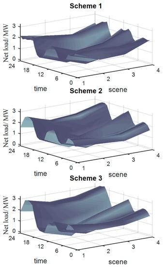 In terms of the system load fluctuation index, the net load fluctuation surfaces of the three schemes are shown in Figure 7.