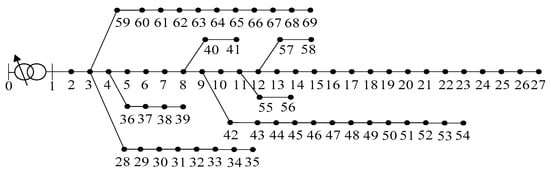 To further verify the effectiveness of the optimization model proposed in this paper, the PG and E-69 bus test system, shown in Figure 8, was used. The system parameters are described in [].