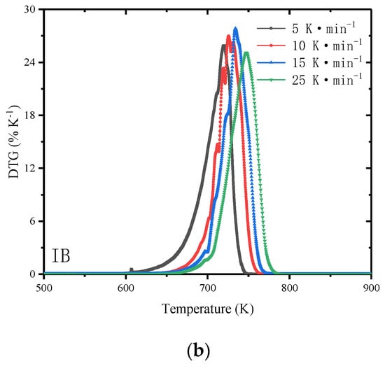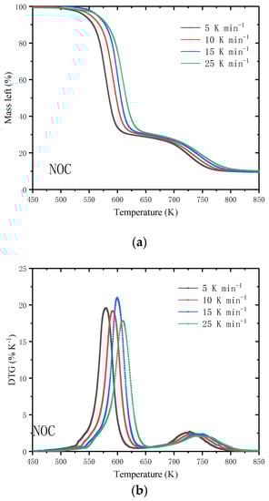Combined with the data in Table 3, it can be concluded that the initial, end, and maximum weight loss temperature of IB and NOC pyrolysis show a lateral shift to a higher temperature. Many researchers considered that the phenomenon occurred because of the heat transfer limitations and thermal lag [35]. The thermal lag means that there had a large difference between furnace temperature and sample temperature, which is more obvious at high heating rates [36].