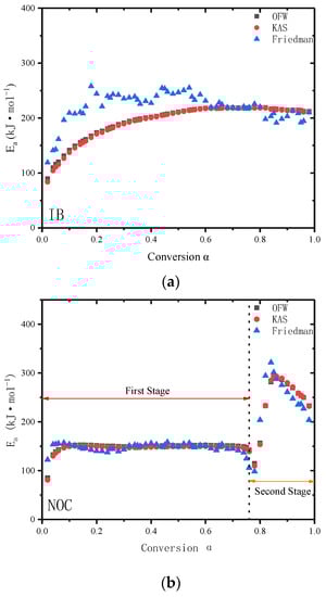 Activation energy values obtained from model-free methods: (a) IB, (b) NOC.