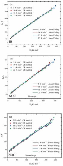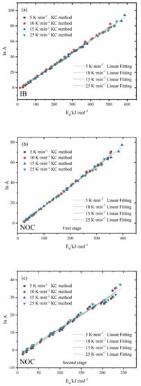 The Kinetic Compensation Effect relationships by CR method at different heating rates: (a) IB, (b) the first pyrolysis stage of NOC, (c) the second pyrolysis stage of NOC.