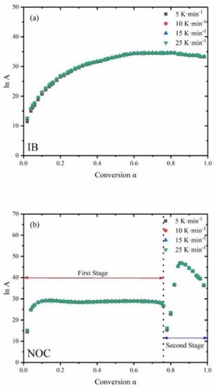 Dependence of pre-exponential factors on conversional extent at different heating rates: (a) IB, (b) NOC.
