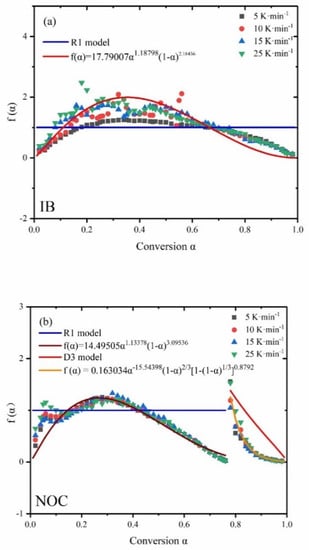 As the aforementioned conclusion in Section 3.3, the reaction models for IB and NOC have been confirmed preliminarily. However, it does not mean that the selected models are the actual reaction models of IB and NOC. The selected model does not necessarily fit well with the experimental data, because the most commonly-used classical reaction models may be not completely suitable for describing the reaction process of solid [40]. Therefore, it is necessary to introduce an adjustment function to modify the known classical reaction models present in Table 2 for reconstructing the reaction model accurately. The adjustment function can be represented by and the modified function can be expressed by the arithmetic products of the adjustment function and a known reaction model [41]. The new modified models for IB pyrolysis can be expressed by Equation (18):