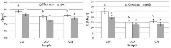 Average particle size (d) and specific grinding energy (Er) of the control wheat (CW) and the dried wheat (AD = air-dried wheat, CM = wheat stored in the climatic chamber). The values in columns designated with different letters are statistically significantly different (p < 0.05).
