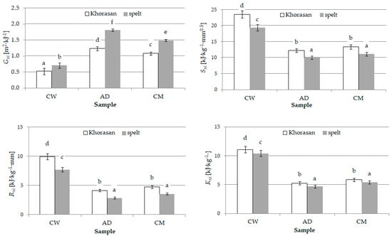 The changes in the physical properties of the studied wheat kernels, determined using the SKCS, are shown in Table 1. The initial MC of the kernels ranged from 11.86% (Khorasan) to 11.68% (spelt). The highest hardness was observed for the Khorasan kernels (average HI = 70.02), whereas significantly lower HI values were observed for the spelt kernels (HI = 24.9). Based on kernel hardness, Khorasan wheat can be classified as hard wheat and spelt as soft wheat []. The mass of the wheat kernels ranged from 40.21 mg (spelt) to 50.87 mg (Khorasan), and their diameters (D) (thickness) varied from 2.16 to 3.12 mm. The studied wheat samples differed significantly in bulk density. The lowest bulk density was found for the spelt grains (745 kg⋅m−3) and the highest for the Khorasan grains (793 kg⋅m−3). The determined physical properties of the grains indicated the quality and processing characteristics of the wheat [,]. In particular, the kernel hardness parameter was useful in determining the grinding and baking properties of the wheat [,].