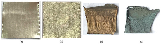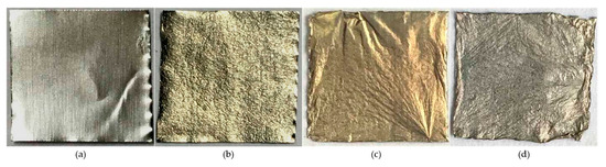 The photos of the aluminum foil substrates without an oxide layer after the CNT formation process at (a): 600, (b): 700, (c): 800, and (d): 900 °C.