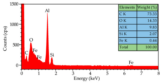 The EDS spectra are shown in Figure 5, confirming the presence of oxygen, silicon, and iron in addition to carbon and aluminum. It is speculated that the high amount of oxygen present in the sample is due to the oxide layer of the aluminum foil. The EDS spectra give evidence that the iron impurity in the aluminum foil catalyzed the growth of CNTs because the elements of silicon and aluminum normally cannot catalyze the CNTs’ growth. In order to ensure that it is iron impurity acting as the catalyst, a high-purity aluminum foil was used as a substrate to grow CNTs at 800 °C, but no CNTs grew. We proved that it is the iron impurity in commercial aluminum foil that catalyzed the growth of CNTs.