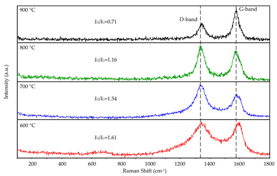 Figure 6 shows the Raman spectra of the CNTs at 600, 700, 800, and 900 °C grown on the substrates with 532 nm laser at room temperature. In three Raman spectra of 700, 800, and 900 °C, two peaks centered at 1336 and 1577 cm−1 were observed, and they are 1336 and 1594 cm−1 at 600 °C. They correspond to the graphitic phase D and G bands, proving the presence of crystalline carbon. The intensity ratio of D peak and G peak (ID/IG) is sensitive to structural defects in the CNTs; the lower the value, the more graphitic the carbon. With the increase of the synthesis temperature, the D peak narrowed and the ID/IG ratio decreased, indicating the increased graphitic crystallinity of the CNTs. The G peak of pure graphite is at 1582 cm−1, and the blue shift of the G peak of the CNTs grown at 600 °C is caused by the high-defect concentration on the samples. The lowest ID/IG ratio (0.71) was found for the sample obtained at 900 °C. We can conclude that most graphitic carbon is obtained at 900 °C.