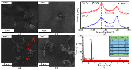 The SEM micrographs and Raman spectra of the CNTs obtained at 600 and 700 °C on the aluminum foil treated by HCl. (a,b): low-magnification images; (c,d): high-magnification images; (e): Raman spectra of the CNTs; (f): EDS spectra of the CNTs at 600 °C.
