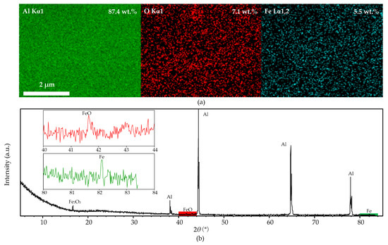 Figure 10a shows the distribution of aluminum, oxygen, and iron on the original aluminum foil surface, and their contents are 87.4%, 7.1%, and 5.5%, respectively; the distribution of iron particles is even. Figure 10b shows the XRD spectra of the original aluminum foil—iron oxide (Fe2O3) peak (JCPDS card No. 16-0653) at 16.2° (2θ), ferrous oxide (FeO) peak (JCPDS card No. 06-0615) at 41.9° (2θ), and a trace of iron (Fe) peak (JCPDS card No. 06-06960) at 82.3° (2θ) were observed. The results prove that the iron impurity on the aluminum-foil surface mainly exists in Fe2O3. However, no Al2O3 peaks were detected in the XRD spectra for its low content.