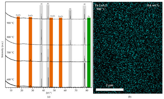 The Fe2O3 nanoparticles are reduced to Fe nanoparticles under the hydrogen atmosphere at high temperatures. Figure 11a shows the XRD spectra of the substrates reduced under hydrogen at 600, 700, 800, and 900 °C. When the temperature is 600 °C, the XRD spectra show that the iron nanoparticles embedded in the alumina layer are Fe2O3 (16.2°, 28.2°, 46.4°, and 56.0° (2θ)), which cannot catalyze the growth of CNTs effectively. When the temperature is 700 °C, a trace of Fe is detected in the XRD spectra, but the Fe2O3 is still dominant. When the furnace temperature increased to 800 and 900 °C, the XRD shows that the Fe2O3 nanoparticles are completely reduced into Fe, which could catalyze the growth of CNTs. The CNTs’ density at 900 °C is higher than at 800 °C, is due to the higher activity of Fe nanoparticles at a higher temperature. The EDS mapping micrograph (shown in Figure 11b) shows the distribution of the Fe nanoparticles on the aluminum foil at 900 °C. The reason for the low iron content (0.6 wt.%) on the aluminum foil surface is that the iron nanoparticles dispersed in the aluminum foil sink into the molten aluminum at 900 °C. The size and distribution of iron nanoparticles on the aluminum foil surface show no difference with the original one (Figure 10a), indicating that alumina effectively protected the distribution of Fe nanoparticles. The uniform diameter of CNTs contributes to the uniform size of Fe nanoparticles in aluminum.
