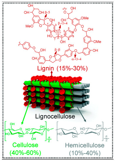 Implementation of lignocellulosic biomass is numerous. Currently, the main usage of lignocellulosic biomass is in the agriculture, forestry, and industrial sectors where it is being used for energy crops, forestry by-products, and wood industry residues [2]. However, lignocellulosic biomass can also be used to produce many other chemical and physical products with the help of a better understanding of its internal structure. Lignocellulosic biomass is usually composed of cellulose (40–60%), hemicellulose (10–40%), and lignin (15–30%) [1]. The cellulose and hemicellulose components can provide sugars for the production of bioethanol, which is one of the most utilized sources of renewable energy. The lignin portion of the lignocellulosic biomass can be used for production of value-added products and heat or steam for electricity production. However, all these applications are not currently being utilized widely because of the challenges in the breaking down of lignocellulosic biomass into its respective usable components such as sugars and lignin.