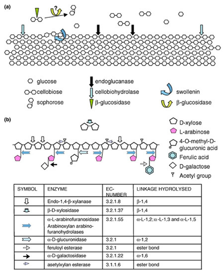 Schematic representation of cellulose and hemicellulose degradation by Aro et al., Transcriptional regulation of plant cell wall degradation byfilamentous fungi, published by Oxford University Press, 2020 [32]. (a): The degradation of cellulose; (b): the degradation of hemicellulose.