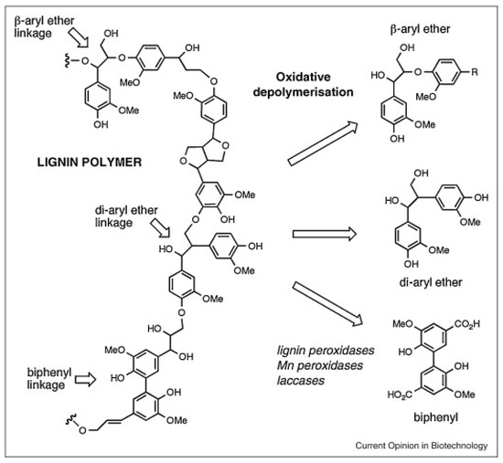 Lignin degradation by lignin modifying enzymes, Timothy et al., The emerging role for bacteria in lignin degradation and bio-product formation, published by Elsevier, 2020 [38].