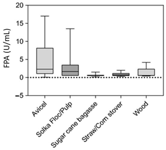 Production of cellulase (filter paper activity) by different types of microbial feedstocks, adapted from Novy et al. The influence of feedstock characteristics on enzyme production in Trichoderma reesei: a review on productivity, gene regulation and secretion profiles, published by Springer Nature [22].