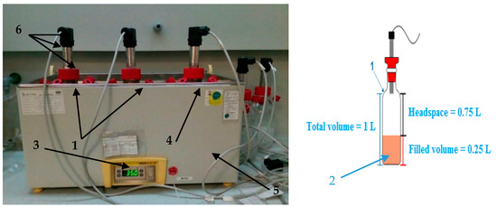 The bio-methanisation potential BMP process was carried out as follows: the tests were done using vessels with a total volume of 1 L fabricated from boro-silicate glass and equipped with a higher neck connected to a pressure sensor (pressure transducer) UNIK 5000 GE Measurement and Control. In BMP experiments, biogas was produced from substrates and inoculums in a batch system. Three bottles, playing the role of a bioreactor, should be continuously shaken and kept under anaerobic conditions during the process of transfer. The bottles were contained in a thermostatic bath and were heated to the desired optimal temperature for the specific anaerobic digestion process. The concept of the BMP test is to measure the volume and composition of biogas production from the anaerobic fermentation of organic waste with anaerobic inoculums at specific conditions. The anaerobic digestion conditions were mentioned in the experimental procedure section (Section 2.5).