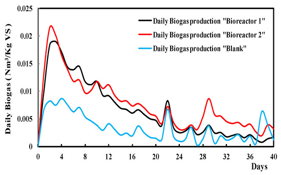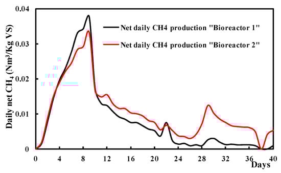 The specific net biogas potential values of the used substrates are equal to 0.493 and 0.610 Nm3/kg VS for bottles 1 and 2, respectively. As a result of this anaerobic digestion, the bio-methane net potential is equal to 0.338 and 0.430 Nm3/kg VS for bottle 1 and bottle 2, respectively. The two yields give respectively a rate equal to 68.60% and 70.52%, respectively. It should be noticed that the biogas composition mostly depends on the type of the organic matter and the anaerobic digestion conditions. Thus, various differences in chemical compositions could result from that. The chemical composition of biogas may be changed as follows: 40–60% CH4, 30–50% CO2, and small amounts of SO2 and NH3 [68]. Figure 8 shows the daily net bio-methane production for the two bottles, obtained from performing batch incubations over a period of 40 days. Bio-methane production rapidly occurred and achieves its maximum on the 9th day. Later, it decreases and practically stops around the 40th day.