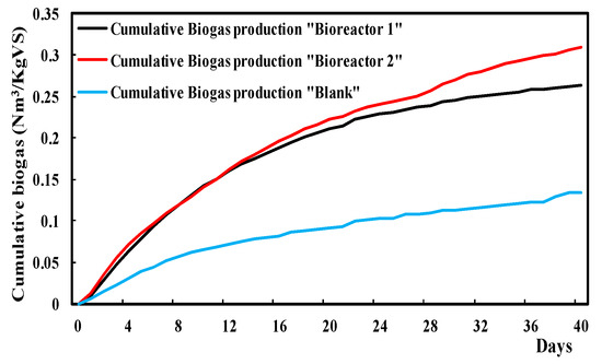 From the previous results, the bio-methane percentage in terms of specific rate is equal to 63.31%, 65.58%, and 51.49% in the total biogas production from bioreactor 1, bioreactor 2, and inoculums, respectively. These findings are in good agreement with those given in the literature, where the bio-methane production should exceed 50% [67].