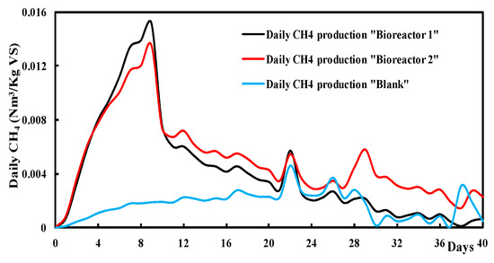Figure 2 shows the startup of the anaerobic digestion process, which corresponds to the beginning of the organic matter degradation by microbial organisms in the bioreactor to form biogas. The degradation process takes 40 days under specific conditions. As can be seen from Figure 4, the degradation occurred without fluctuations in terms of the bio-methane production at the beginning, especially during the first nine days. The absence of fluctuations means that the degradation of the substrate started almost immediately, and proceeds without problems in all the digestion periods. Thus, bio-methane production is significantly increased. This result is in good agreement with that found by the work of Maamri and Amrani [59], in which they showed that, due to the exponential growth of microorganisms and to their higher adaptation in the anaerobic climate, they can produce the biogas/bio-methane immediately. Anaerobic fermentation of organic wastes is a process that involves various bacterial species, such as hydrolytic, acid-forming, acetogenic, and methanogenic bacteria which have respectively CO2, H2, CH3COOH, and CH4 as main products. During the degradation process, only 30% of the methane produced comes from CO2 reduction carried out by specific methane bacteria [60]. As a result, Figure 2 showed that the biogas started to drop after day 4 because of the decrease in CO2 production. However, bio-methane kept increasing until day 9 (Figure 4). The substrate of digestion is consumed continuously following anaerobic digestion, contributing to a decrease in the biogas/bio-methane production [61]. In this work, biogas/bio-methane production decreased after the production peak respectively in day 4, Figure 2, and day 9, Figure 4. The difference in the daily outputs among all the experimental groups decreased with time. The gas production was also decreased on completion of 40 days of digestion. In addition, it can be seen from graph 2 and graph 4 that the two bioreactors experienced unsteady growth between days 22 and 29. In this period, fluctuations become observable. This is due to a change in temperature and the level of water in the bath, which changed the digestive environment. As shown in [62], variation in temperature of ±2 °C may affect the digestive environment. The AD takes place only under specific conditions, and the efficiency of the anaerobic process, the growth, and activity depend on several factors. Therefore, it is very important to ensure optimal conditions for the development of anaerobic microorganisms as stated by Stuhli [63].