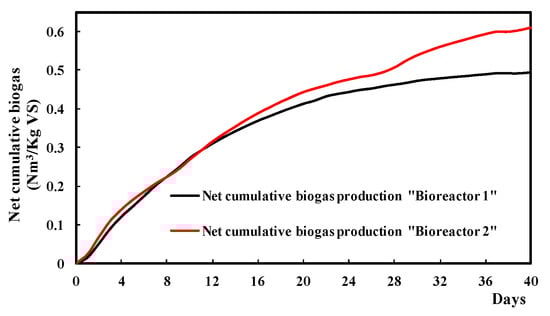 Graphical representation of net cumulative biogas/bio-methane production is shown in Figure 6 and Figure 7, respectively, for the two bioreactors (bottles) that contain both substrates and inoculums. The net biogas and bio-methane volume should be calculated to get the real yield of the substrate’s productions. Total biogas production should be corrected to get the net production. Equations (6) and (7) report material balances that give the net yields: