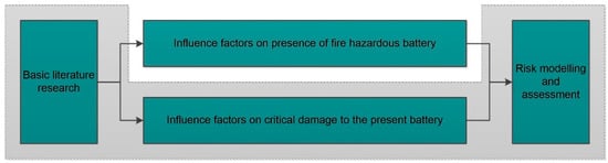 Figure 1 displays the overall approach and the boundaries of this study. After the basic step of literature research, two different workflows were followed. The first was covered by two previous publications and it is about the presence of a hazardous battery; the second, is about the critical damage done to a present battery (which, consequently, leads to a battery-caused fire) and it is covered by this study. Afterwards, the results are combined in the overall risk modelling and assessment.