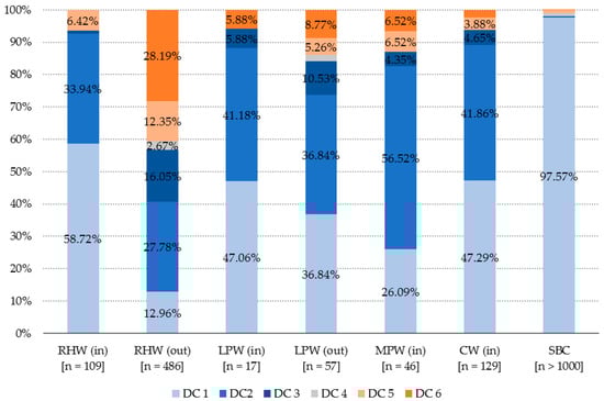 Moreover, when comparing the residual household waste before (RHW (in)) and after (RHW (out)) treatment in a respective facility, it is noticeable that the percentage of the lower degrees of damage (DC 1 to 3) are reduced, while the percentage of the higher damage classes (DC 4 to 6) are increased (from approximately 6% to over 40% in total).