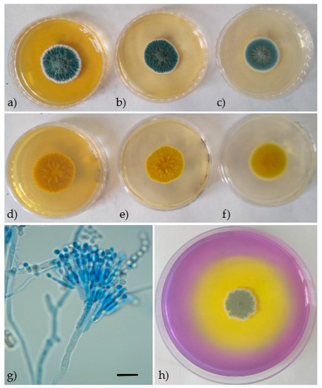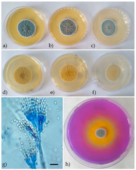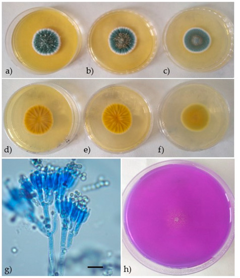 Penicillium crustosum. Seven-day-old colonies on Malt Extract Agar (MEA) (a) obverse, (d) reverse, Czapek Yeast Autolysate agar (CYA) (b) obverse, (e) reverse, Yeast Extract Sucrose agar (YES) (c) obverse, (f) reverse, (h) Creatine Sucrose Agar (CREA)—good acid production, (g) conidiophores and conidia. Scale: black bar = 10 µm.