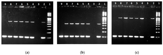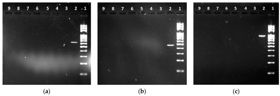 Electrophoretic analysis of amplicons of Penicillium (P.) isolates from table eggs by conventional PCR. (a) P. verrucosum: Line 1: 100 bp ladder standard; Line 2: P. verrucosum (ATCC® 44407™); Line 3: negative control; Lines 4 to 8: isolates of P. verrucosum (607 bp); Line 9: 18S rRNA internal control (99 bp); (b) P. commune: Line 1: 100 bp ladder standard; Line 2: P. commune (CCM F-327); Line 3: negative control; Lines 4 to 8: isolates of P. commune (464 bp); Line 9: 18S rRNA internal control (99 bp); (c) P. crustosum: Line 1: 100 bp ladder standard; Line 2: P. crustosum (CCM 8322); Line 3: negative comtrol; Lines 4 to 8: isolates of P. crustosum (892 bp); Line 9: 18S rRNA internal control (99 bp).
