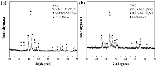 The results of the XRD analysis of the 20%WC + Co spray welding layer with different contents of Fe-based amorphous alloy are shown in Figure 1. It was found that the spray welding layer is mainly composed of carbides such as WC, Cr,Fe,Ni,Co(W,C) and (Cr,Fe,Ni,Co)3W3C, as well as the alloy phase of Cr, Fe, Ni and Co. Cr,Fe,Ni,Co(W,C) is an fcc solid solution of W and C in the metal lattice with a larger lattice parameter, whereas (Cr,Fe,Ni,Co)3W3C is a metastable sub-stoichiometric ternary carbide called η-phase (M6C, where M = metal). Since the Cr, Fe and Co elements have a strong affinity with the C element, they could form carbides easily. The carbides have both a high hardness and excellent wear resistance and can be used as a hard phase supporting matrix, which can greatly improve the hardness and wear resistance of the spray welding layer [34]. Figure 1b shows the XRD analysis results of Fe-20. Compared to Fe-5, a much harder phase was formed on the surface of the substrate. This can be attributed to the fact that an increase of the Fe content would generate a harder phase in the spray welding process, which is conducive to comprehensively improving the hardness, wear resistance and other mechanical properties of the spray-welding layer.