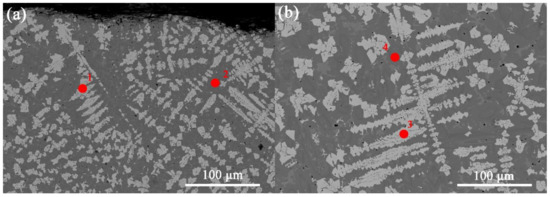 The typical surface morphology of the coatings with a different Fe-based amorphous alloy content are characterized by SEM, as shown in Figure 2. The Fe-based amorphous alloy content of 5% is shown in Figure 2a, where it can be clearly seen that the white phase is the carbide phase, which is the main existing style of carbide particles in the spray welding layer, and the dark gray phase is mainly the matrix solid solution phase. As shown in Figure 2, the white carbide phase mainly exists in the form of regular dendrites in the spray welding layer. As the Fe-based amorphous alloy content increases, the number and size of dendritic solidification structures also increase, as shown in Figure 2b. It is worth noting that few WC particles are observed in the coating surface, which is due to the different melting points and densities of WC and the metal phase during the rapid cooling rate in the plasma spray welding process. The WC melting point, which is the highest compared to that of the metal phase, is about 2870 °C. During the process of coating formation, the metal phase is melted into liquid owing to the higher hot plasma energy, while the WC powder is hard to melt. Then, the WC powder with a high density would sink down inward because of gravity. In order to confirm the main phase in the coating surface, the elemental composition of the surface of the spray welding layer was analyzed, and the results of points 1–4 are shown in Table 3. It can be clearly seen that points 1 and 3 have the same elements, including C, Si, Cr, Fe, Co, W and Ni. And so do points 2 and 4, compared with points 1 and 3, which lack the Si element. The results indicate that the white area’s chemical component in the dendritic crystal is composed of WC and that the dendritic crystal is mainly composed of (Cr,Fe,Ni,Co)3W3C, while the matrix’s solid solution phase is mainly composed of Cr,Fe,Co,Ni(C). Moreover, it was found that the Fe, Cr, Ni and Co elements in the carbide phase are significantly less than that in the matrix, while the W elements in the carbide phase are more numerous than that in the matrix.