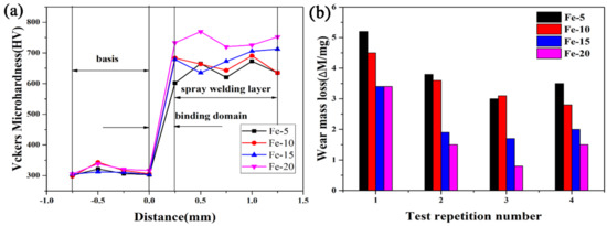 The influence of the contents of Fe-based amorphous alloys on the binding quality, microhardness and wear resistance property of the spray welding layer was further studied. Figure 4 shows the binding quality of the coating to the substrate. It can be seen that when the Fe-based amorphous alloy content is 20%, the spray welding layer can be well combined with the substrate, and when the Fe-based amorphous alloy content is relatively lower, the spray welding layer cannot form an excellent cladding with the substrate. When the content of the Fe-based amorphous alloy is 5%, the spray welding current is relatively too large to meet the requirement of the spray welding, so that the spray welding layer cannot be well fused with the substrate, resulting in spray welding defects. The microhardness distribution ranging from substrate to coating is shown in Figure 5a. It can be clearly seen that the hardness of the 42CrMo steel substrate is about 320 HV and the hardness of the spray welding layer is about 650–750 HV. The microhardness of the coating is about two times higher than that of the substrate for each coating. The microhardness of the spray welding layer fluctuates slowly, which may be caused by the difference in the size and quantity distribution of the hard phase. It was found that the hardness gradient in the bonding domain is large, which is a typical characteristic of the hardness distribution of the spray welding layer. This is the result of the sprayed liquid alloy and the matrix, which diffuse and penetrate each other, and the C element in the alloy power plays a solid solution strengthening effect [38,39]. Besides, as the content of Fe-based amorphous alloys increases, the microhardness of the spray welding layer increases, and has a great relationship with the microstructure. The increase of the carbide phase in the spray welding layer and the distribution lead to an increase in the hardness of the spray welding layer [40,41,42].