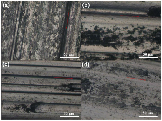 To further explore the influence of different Fe-based amorphous alloys on the wear resistance of the spray welding layer, frication and wear experiments were carried out on the samples. The morphologies of the worn surfaces of the coatings are shown in Figure 6. Figure 6a–c shows the SEM images of Fe-5, Fe-10 and Fe-15. Deep furrows and scratches are clearly visible on the sample surface, caused by the splashing and agglomeration of Fe-based amorphous alloys. The powder fails to effectively bond with the matrix when it is melted, resulting in a decrease in the Fe-based amorphous alloys content in the spray welding layer and an increase in the austenite phase content. The spray welding layer becomes soft, causing the furrows to deepen. Figure 6d shows the wear morphology of the Fe-20 spray welding layer. Fewer scratches and spalling pits were found, and there are almost no deep furrows in the spray welding layer’s wear scars. Meanwhile, more hard phases are scattered in the spray welding layer. The structure is small and uniform, and the hardness and toughness reach a good level. Therefore, the spray welding layer has a better wear resistance.