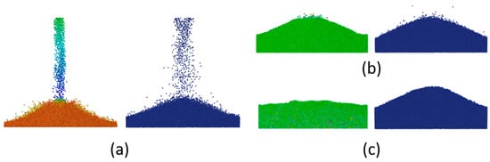 DEM simulations of particles falling through a slit in a commercial program (left) and MFiX (right): (a) particles falling; (b) all particles have fallen; (c) the system has stabilized.