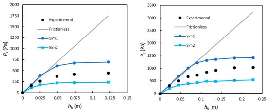 Figure 3 displays the trends of the bottom solids pressure for both columns. As explained in the previous section, the data for each bed height were obtained from a different simulation. An inspection of the plots permits inferring that both the Sim1 and Sim2 approaches can qualitatively reproduce the phenomenon. Although at shallow depths the solid pressure increases linearly, it becomes asymptotical for greater depths. The pressure remains roughly constant when the hb/D ratio exceeds 2, which is also close to z = 2 zsat in Janssen’s approach (provided that the product μK is about 0.25).